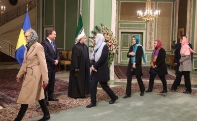 The second picture shows a Swedish government delegation led by trade minister Ann Linde to Tehran early last year. Prime Minister Stefan Lofven’s government in Sweden proudly calls itself the “first feminist government in the world”. Except, it seemed, their feminism is not for the Iranian women.